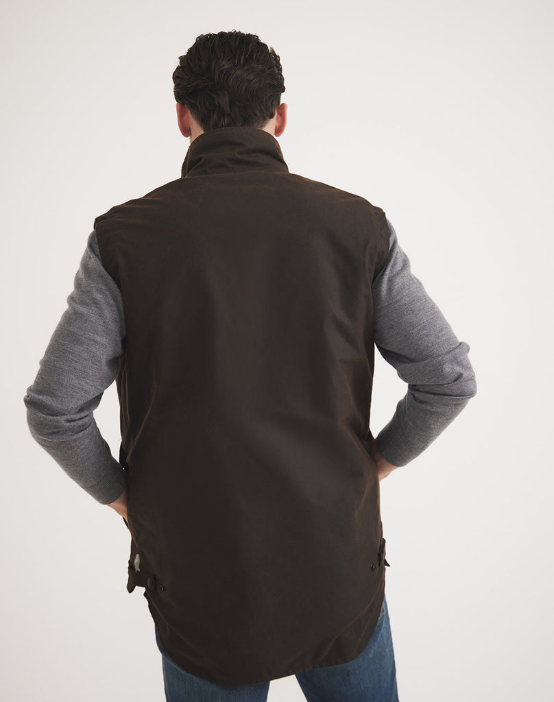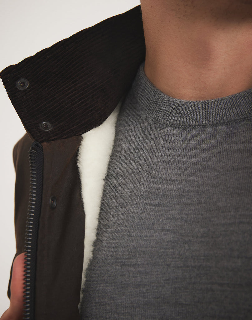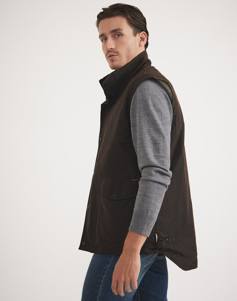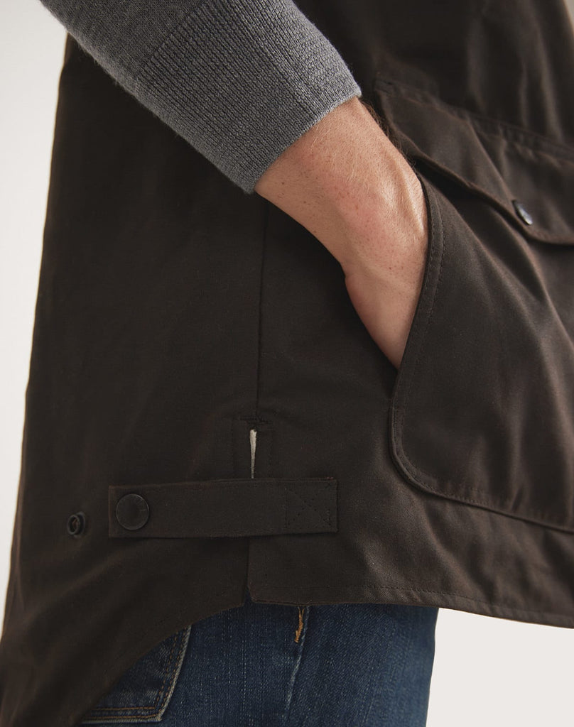 Rugged yet detailed, the Jumbuck Heritage Vest is crafted from our premium wind and water resistant oilskin, with 100% wool shearling lining and a corduroy lined collar. A side split with adjustable tab allows for extra movement.