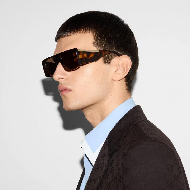 Acetate styles characterized by a cool and commercial look embellished through a metal plaque that runs on the top of the temple. Oversize flat top shape. Gucci lettering logo lasered on the metal plaque. Cool and sporty color combinations between acetate and web embellishment (blue-red-blu & green-red- green).