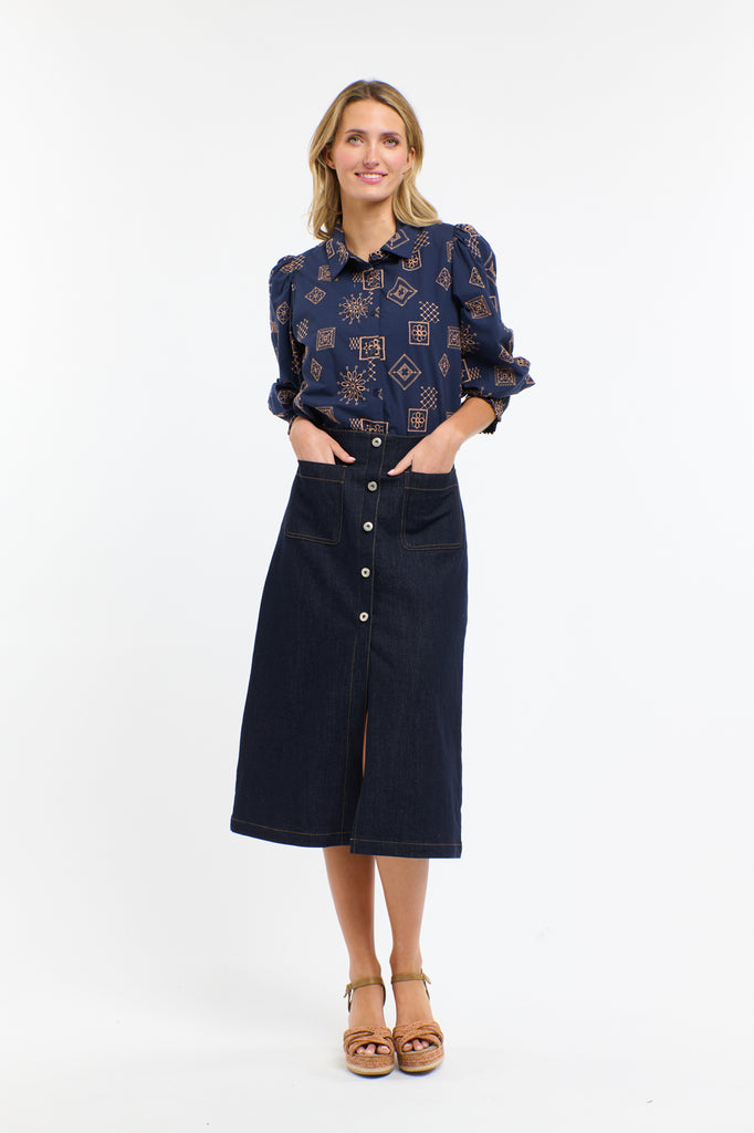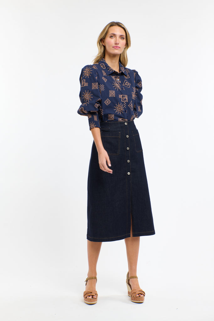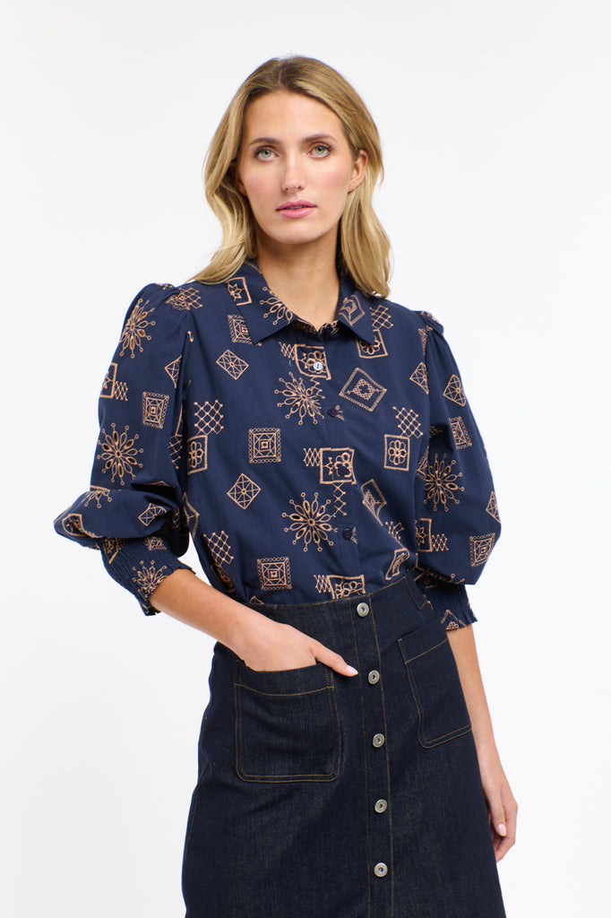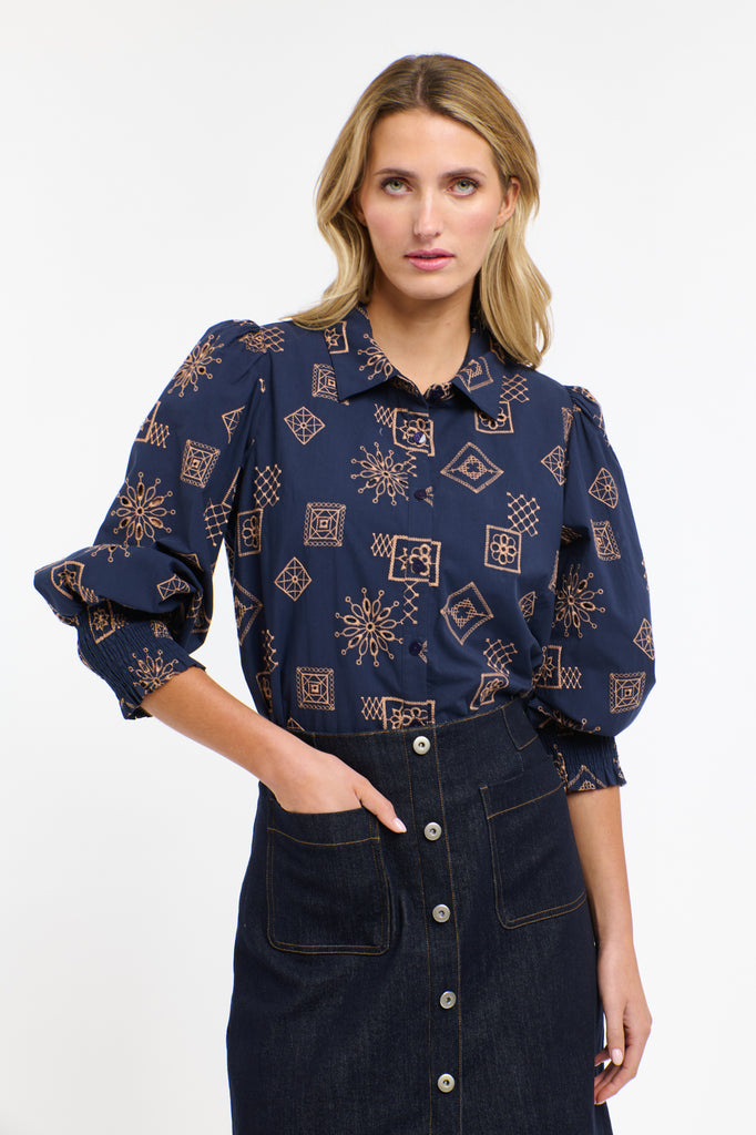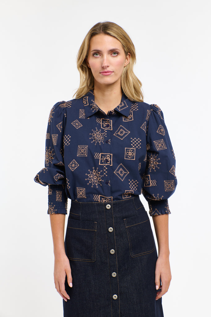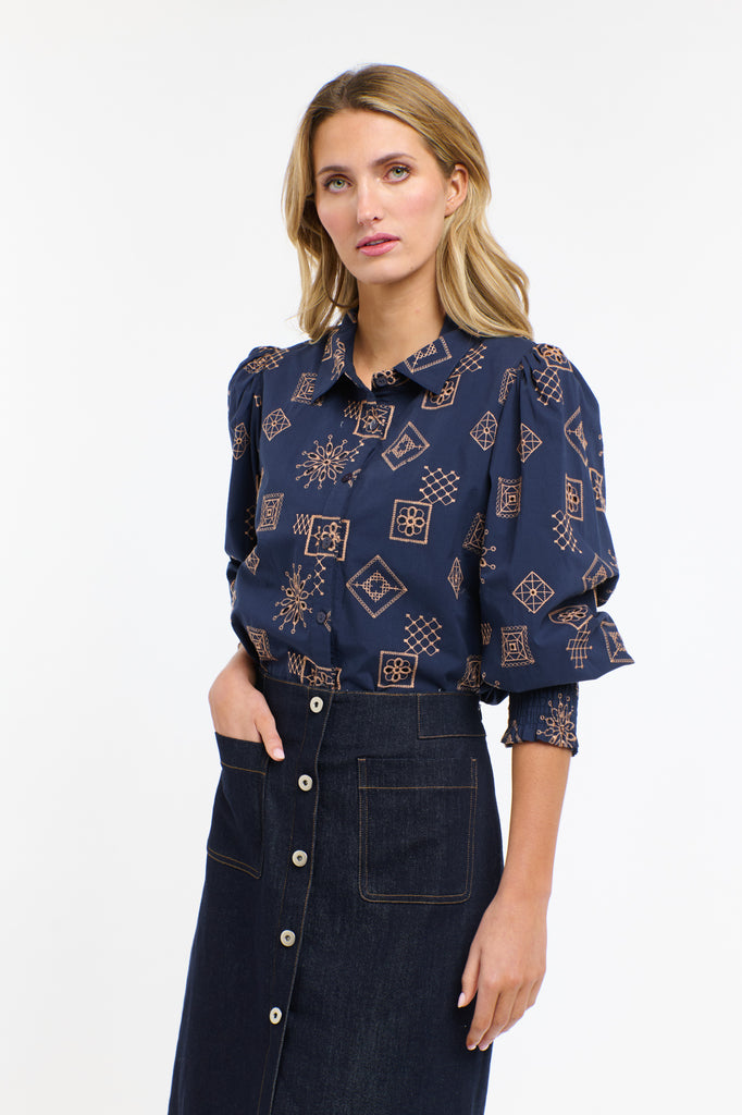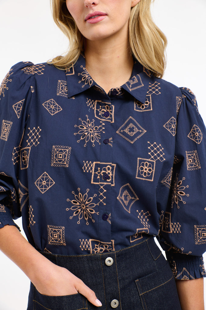 With its all-over embroidery and softly tailored silhouette, the Mandala Shirt offers a polished take on pattern. A structured shirt collar and button-through front bring classic balance to the feminine shape, while subtle gathers at the shoulder and cuff introduce soft volume. Pair with denim or tailored pants, or tuck into a skirt for refined ease.