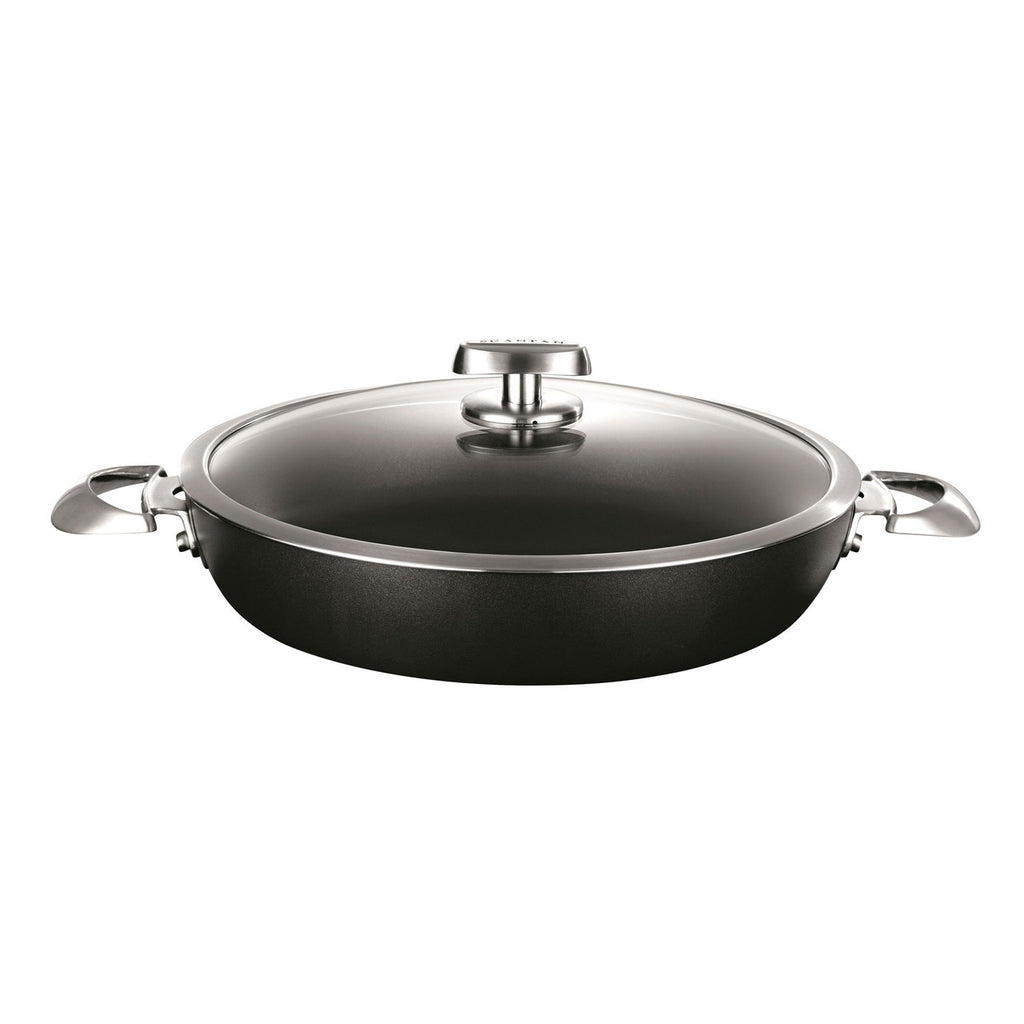 The Pro IQ range has all the features we have come to expect from SCANPAN of Denmark. This 32cm chef pan with lid is made from 93% - 96% recycled aluminium, squeeze cast for quick and even heat distribution, with SCANPAN's exclusive STRATANIUM non-stick coating. The quality stainless steel trims and ergonomic handle are both attractive and practical. The Pro IQ range is suitable for all cooktops including induction.